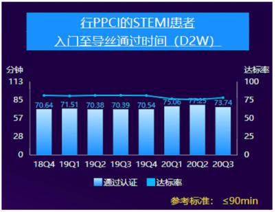 虽然受疫情影响,2020年的平均D2W时间有所回升,但从上图中可以看到,到2020年第3季度,接受直接PCI治疗的STEMI患者平均D2W时间已经重新回落到74分钟左右。