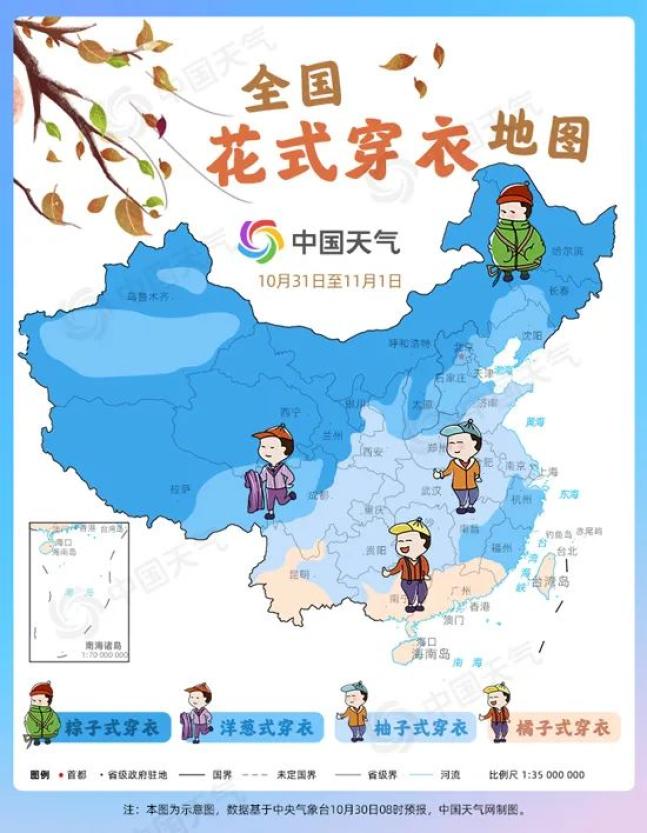 有些地方气温似荡秋千般一会升一会降,有些地方气温却依旧很稳,比如广东、广西、海南、云南等地。这股冷空气长途跋涉能量消耗,制冷能力越往南越差,所以本周末华南气温依旧稳稳的,像是广州本周末最高气温在28~29℃,依然在过夏天。怕凉的小伙伴们采用“橘子式”穿衣法,早上出门加一件薄外套即可,防晒防凉功能兼具。