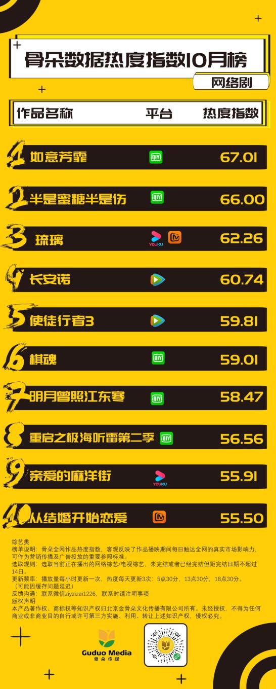 原标题:《10月网剧月榜丨《如意芳霏》登顶,《半是蜜糖半是伤》排名第二》