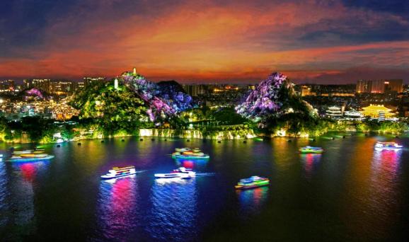 蟠龙山夜景《夜话柳州》由著名导演张继钢任总导演的《夜话柳江》“百里柳江”水上实景演出以璀璨的蟠龙山为背景,以宽阔的柳江河为舞台,以水上水下的奇幻表演、天上人间的特技展示,为广大市民、游客呈现“典雅、惊艳、现代、时尚”的柳州全域旅游新景象,通过人文景观、民族文化与旅游结合,让人们在领略自然之美中感悟文化之美、陶冶心灵之美,切实增强人民群众获得感、幸福感。