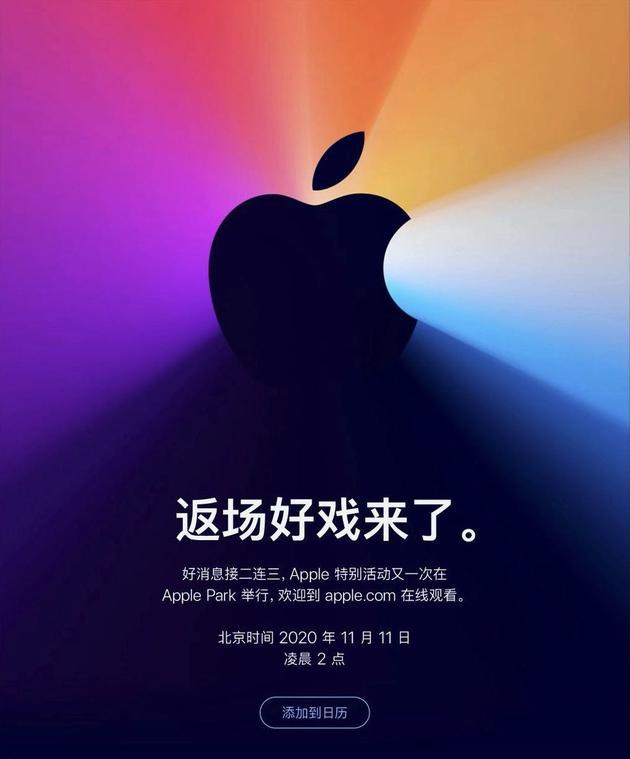 双十一苹果也不会缺席。北京时间11月3日凌晨,苹果发布邀请函,确认将于当地时间11月10日(北京时间2020年11月11日凌晨2点)在Apple Park举办发布会,这也是今年的第四次线上发布会。