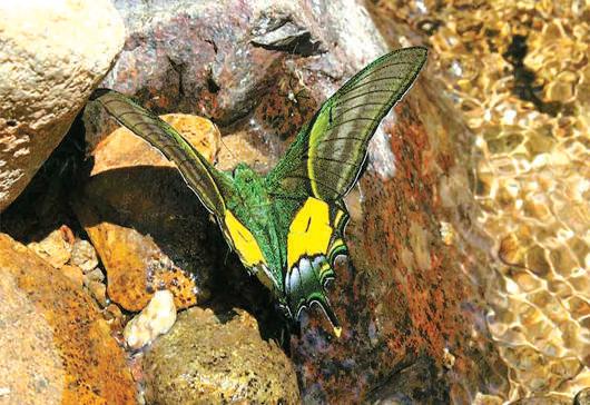 金斑喙凤蝶被誉为“国蝶”,分布在吊罗山海拔1000米左右的山地常绿阔叶林中。金斑喙凤蝶属凤蝶科喙凤属,体长30毫米左右,翼展约110毫米,前翅上各有一条弧形金绿色的斑带,后翅中央有几块金黄色的斑块,后缘有月牙形的金黄色的斑,后翅的尾状突出细长,末端一小截金黄色,姿态优雅华丽。