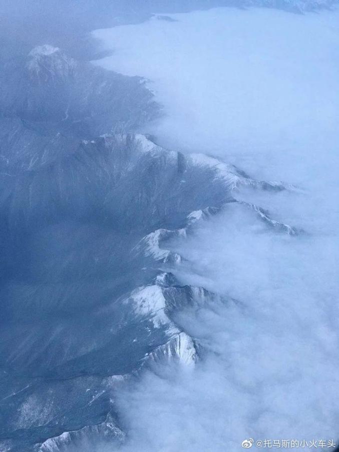 有网友发微博称:飞机上航拍的秦岭,以一己之力,挡住南下冷空气。