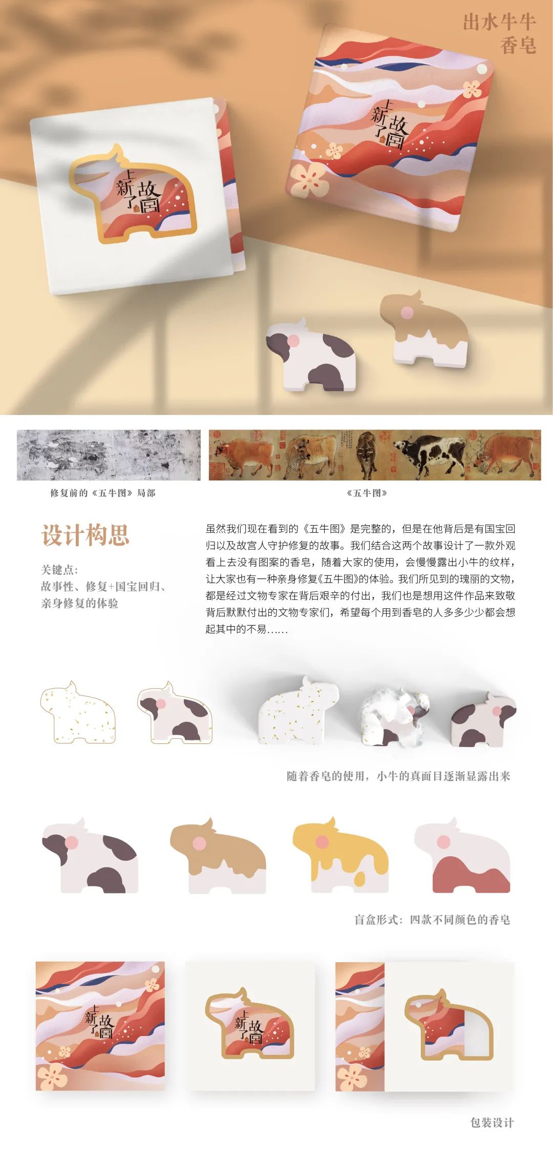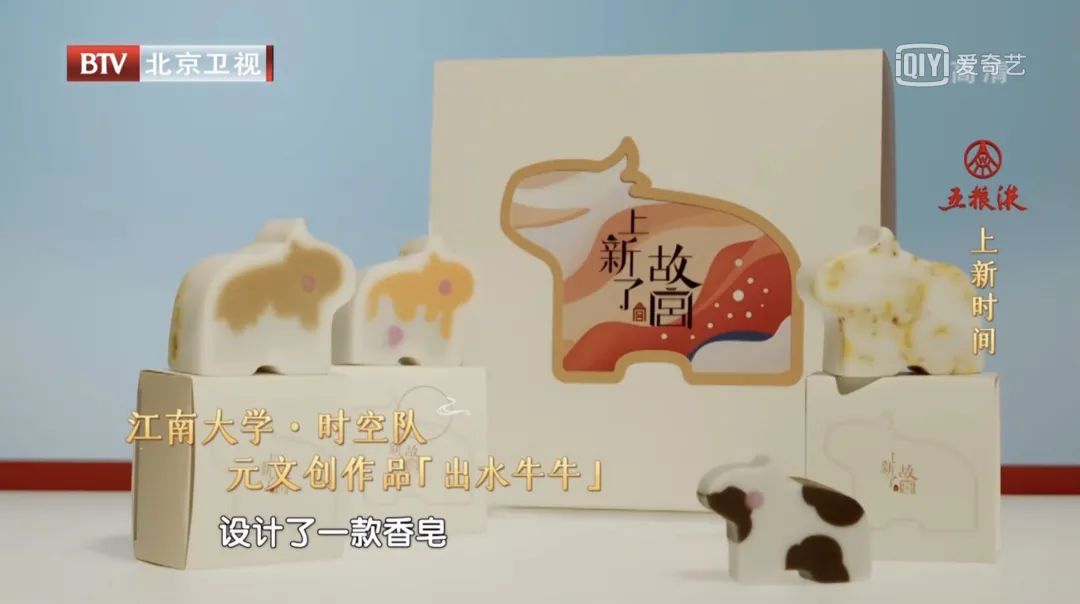 小小香皂的背后是国宝回归、故宫人守护修复的历史,我校学子结合这两个故事,将其设计成一款外观看上去没有图案的香皂,但随着大家的使用,会慢慢露出小牛的纹样。使用肥皂的过程其实也是体验修复文物《五牛图》的过程,以盲盒的形式呈现更加引发了大众的好奇心。