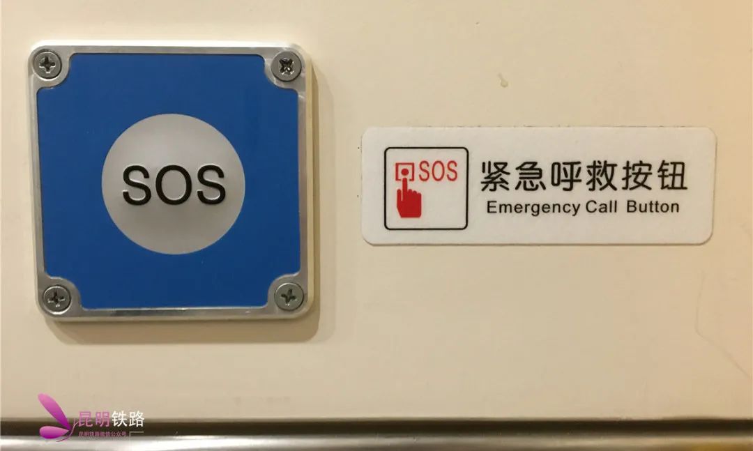 这个按钮是按压式,不是触碰式,旅客朋友们按下去后,会听到一阵有些大的噪音,蹲坑或马桶内开始冲水,真空集便器开始工作,这就算成功了。下面这个是紧急呼救按钮,上面印着国际通行的求救信号“SOS”,供旅客朋友在卫生间内遇到紧急情况呼叫乘务员使用。大家不要按错啊。