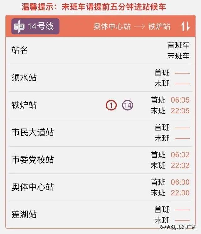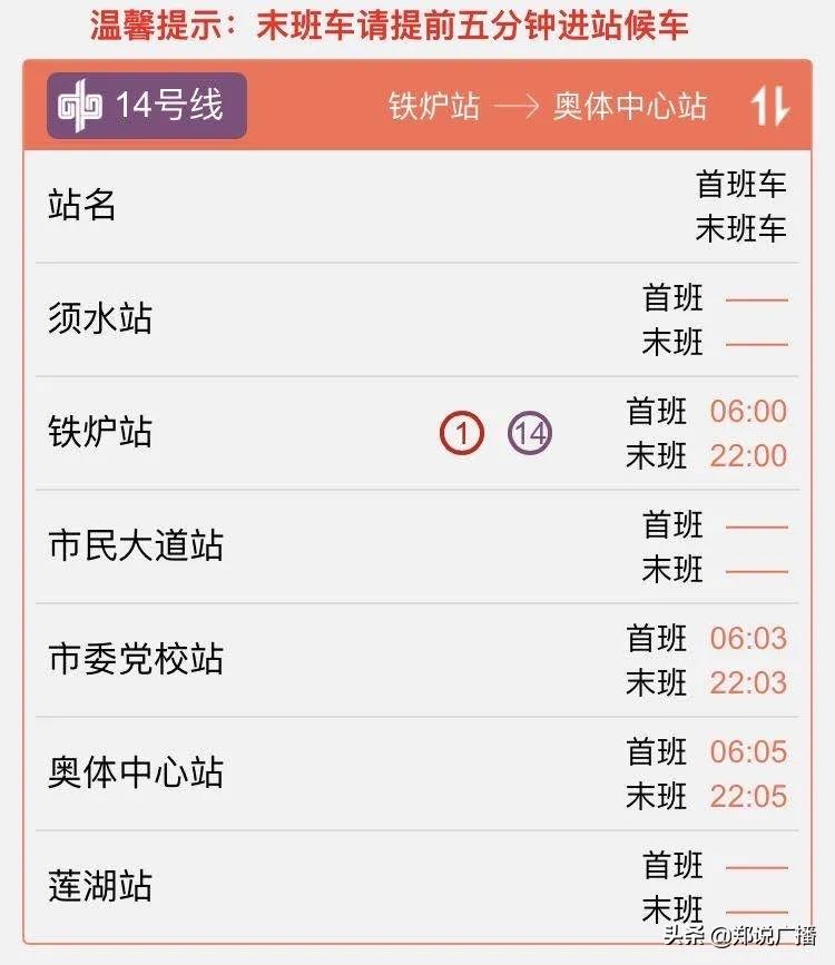 恢复运营后,14号线一期的运营时间为早6点到晚10点,行车间隔约为15分30秒。郑州地铁温馨提醒广大乘客,乘坐地铁时请全程佩戴口罩,做好个人健康防护。在乘车过程中如需帮助,您可拨打郑州地铁服务热线55166166或通过官方微博、微信公众号获取运营信息。