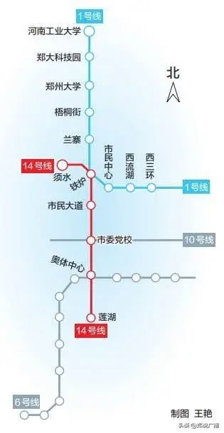 郑州地铁14号线一期工程于2019年9月19日正式开通载客,线路全长约7.5千米,均为地下线,设有须水站、铁炉站、市民大道站、市委党校站、奥体中心站、莲湖站6座站点。其中,设换乘站3座,与1号线在铁炉站换乘,未来与10号线在市委党校站换乘、与6号线在奥体中心站换乘。在运营初期,14号线开通铁炉站、市委党校站、奥体中心站3座车站,其它三座车站将在周边配套设施完善后适时开通。