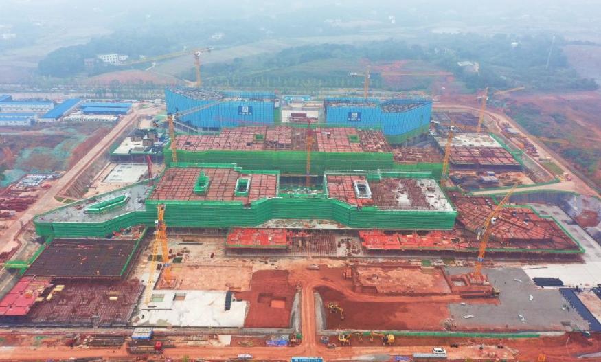 长沙县人民医院项目进入百日攻坚阶段,预计2021年农历春节前完成主体封顶。陈盼 摄当天,在项目施工现场可以看到,北区病房楼、中区医技楼、南区门诊楼已经初具雏形。塔吊、挖掘机、钩机、推土机、压路机、装载机等多台大型机械在有序作业,700多名工人分散在项目各处,在各自岗位忙碌,远远望去,场面十分壮观。