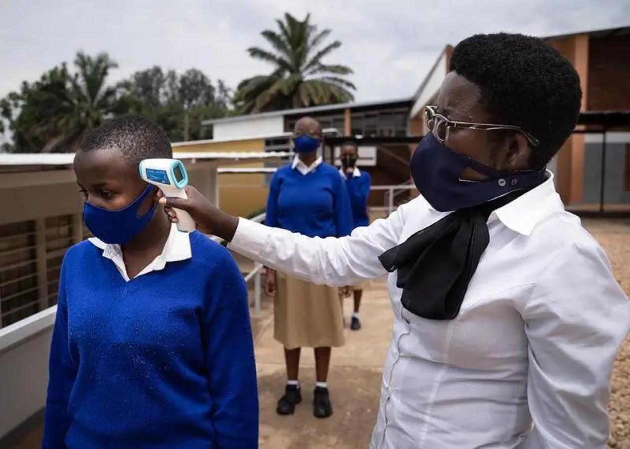 当地时间11月2日,卢旺达中学学生在课前测量体温。由于新冠疫情爆发,该国各地学校实行严格的封锁措施。据美国约翰斯·霍普金斯大学实时统计数据显示,截至北京时间2日15时24分,全球新冠肺炎死亡病例已超120万例,这是新冠疫情暴发以来,又一悲剧性里程碑。距9月29日全球新冠死亡人数超100万人,仅过去34天。新冠死亡人数排在前五位的国家,分别是美国、巴西、印度、墨西哥和英国。其中,美国、巴西和印度的死亡病例均超10万例。随着疫情“寒冬”来临,美国和欧洲的病例不断攀升。图片:Simon Wohlfahrt / AFP