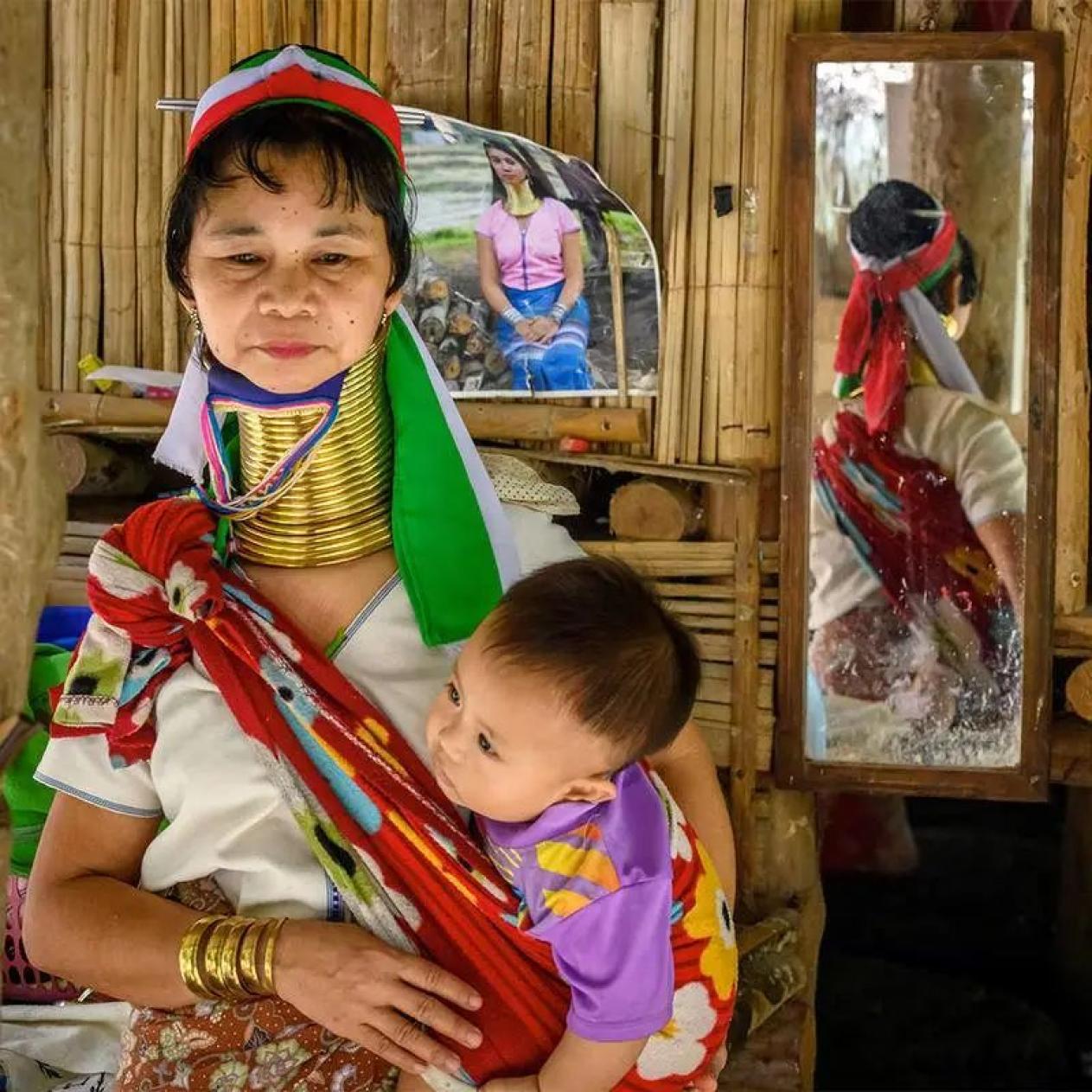 当地时间11月2日,在清迈以西30公里处的长颈族村落,一名长颈族妇女抱着孩子。“长颈族”属于泰缅边境少数民族克耶族的巴东族,主要居住在清迈、清莱府、湄宏顺等地区。当地人以颈长为美,女人一直保持脖子套铜圈的传统习俗。当地女孩从5-6岁起,就在脖子上套铜圈,使脖子拉长,最长颈者脖子达70厘米。许多旅行社从中寻到商机,利用铜环文化特色,吸引游客蜂拥而至,一窥“长颈妇女”。新冠疫情爆发后,这个曾挤满游客的村落如今门可罗雀。由于收入骤减,长颈族人生活陷入困境,许多家庭纷纷搬走,只留下空荡荡的房屋和摊位。据《日经亚洲评论》报道,原本有20个家庭居住的湄林长颈族村,今年7月下旬只剩3个家庭。图片:Mladen ANTONOV / AFP