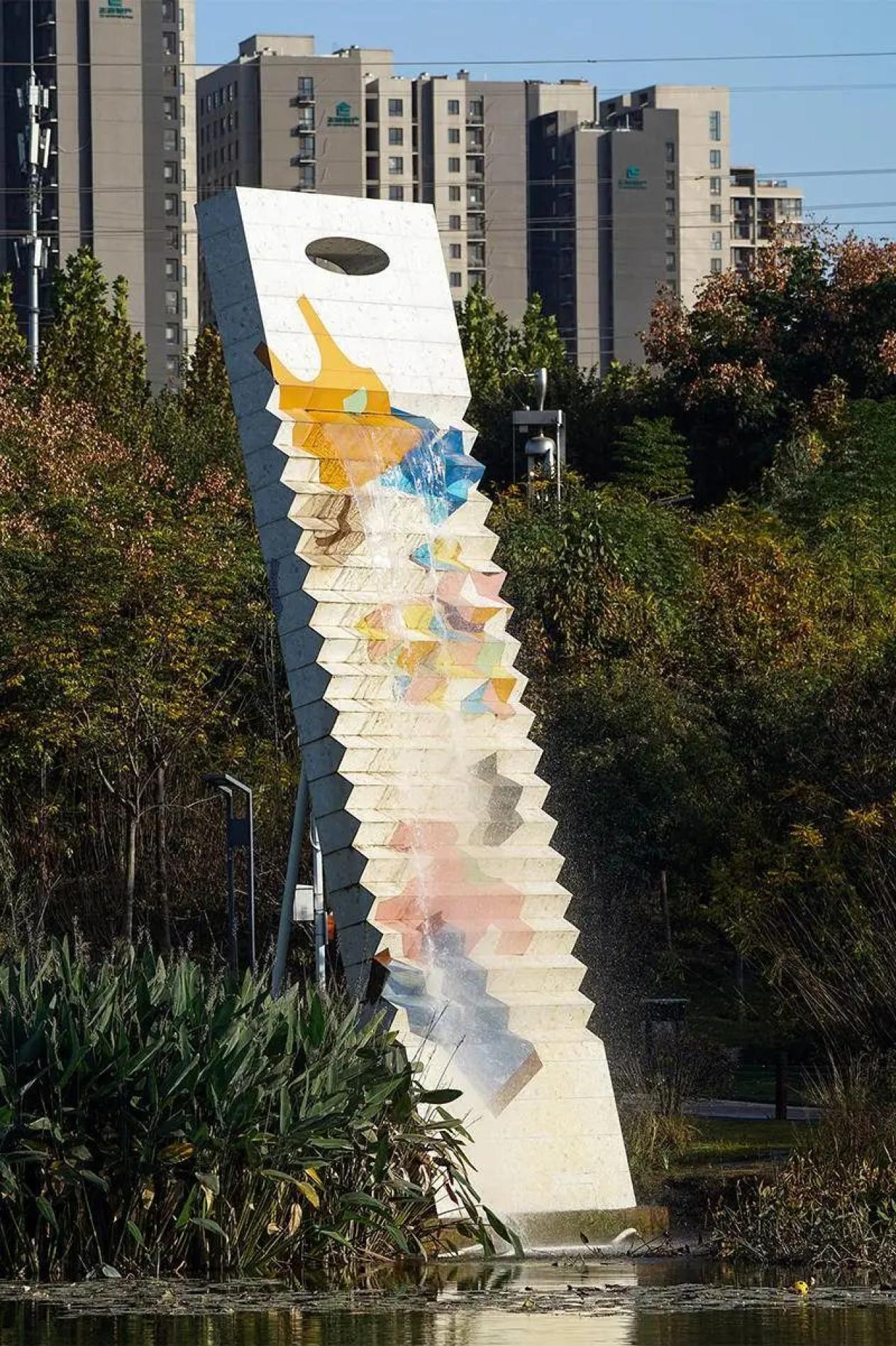 11月2日,在郑州市雕塑公园,一个高10米的“搓衣板”立在湖旁边,搓衣板上有清水流下来,流入湖中。这是雕塑公园的一件雕塑作品,名字就叫“搓衣板”,作品介绍中写道:“作品将搓衣板放大,置于河旁溪畔,表面彩绘五彩斑斓的各式童装,轻松活泼的形式,却如一个庄重的母爱纪念碑,慈爱善良、含辛茹苦,皆无声地镌刻其上,叠泉倾泻,更增添感人的力量。”图片:视觉中国