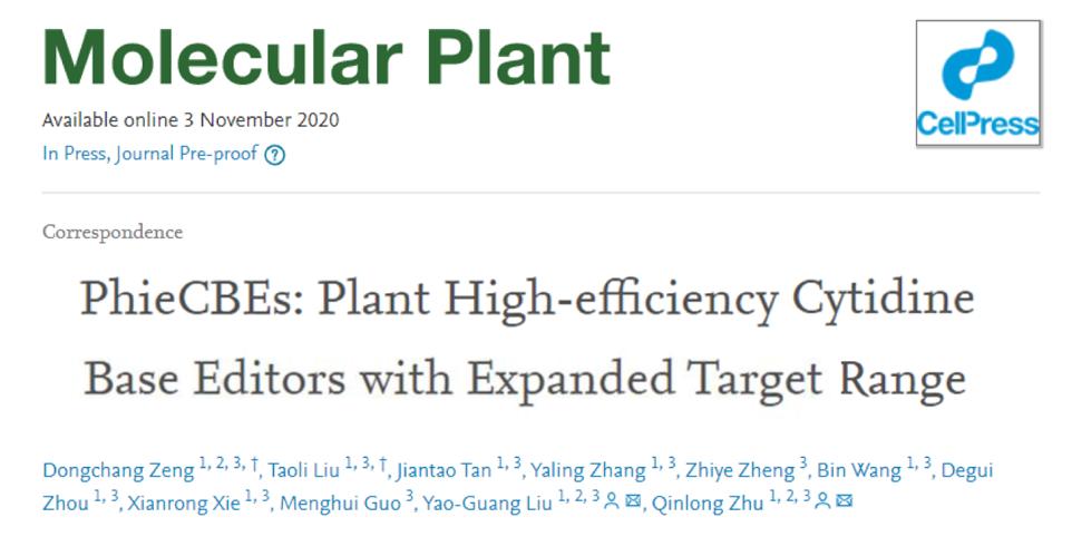 【学术前沿】刘耀光院士团队开发高效、广靶向的植物胞嘧啶碱基编辑器PhiCBEs