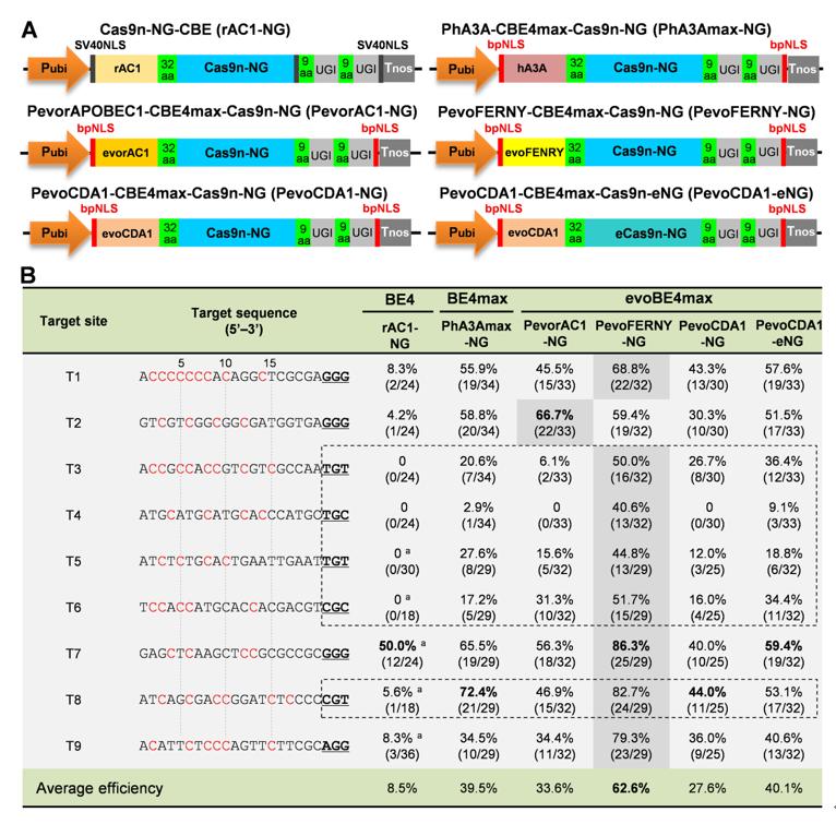 目前已有的不同世代版本的CBE系统(BE1、BE2、BE3和BE4等)在植物细胞中的编辑效率普遍不高,且采用的来自大鼠的胞嘧啶脱氨酶rAPOBEC1的CBE对靶点序列具有偏好性,即更易于编辑TC、CC位点(下划线为被编辑碱基),而几乎不编辑GC位点,因此编辑效果极不稳定。采用来自七鳃鳗鱼的PmCDA1脱氨酶和来自人的APOBEC3A脱氨酶(hA3A)的编辑器在一定程度上提高了植物单碱基编辑效率和扩大了编辑窗口。此外,一种基于靶向差异sgRNAs的代理报告系统DisSUGs,也提高了植物单碱基编辑效率。目前大多数CBE系统是使用融合识别NGG-PAM的Cas9n变体,因此降低了基因组靶点的选择自由度。这些因素限制了单碱基编辑器在植物中的广泛应用。尽管Thuronyi等人利用噬菌体辅助连续进化获得了功能更强的进化型胞嘧啶脱氨酶(如evorAPOBEC1,evoFERNY和evoCDA1等),并与Cas9n变体融合开发了evoBE4max类型编辑器,实现了哺乳动物细胞中的无靶序列偏好性的高效胞嘧啶碱基编辑。但是,仍不清楚这些进化型脱氨酶与靶点选择性更广泛的Cas9n-NG(识别NG-PAM)变体构成的CBE在植物中是否有效。刘耀光院士团队根据水稻密码子偏好性重新优化了evorAPOCBEC1、evoFERNY、evoCDA1和hA3A的核苷酸序列,并将这些脱氨酶基因序列与Cas9n-NG基因融合,并在两端加入更高效的核定位信号bpNLS,构建了四个高效的植物胞嘧啶单碱基编辑器PhieCBEs(PevorAC1-NG、PevoFERNY-NG、PevoCDA1-NG和PhA3A-max-NG);另外,将高保真eCas9变体进一步突变成一种新的eCas9n-NG变体(识别NG-PAM),与evoCDA1融合构建了一个新的PhieCBE PevoCDA1-eNG。以这些PhieCBEs对水稻的9个靶位点(含有NG-PAM或NGG-PAM)进行了系统的编辑效率和特征测试。结果显示,PhieCBEs和一种BE4编辑器(rAC1-NG)对照相比,其平均编辑效率提高了3~8倍,并消除了碱基序列环境的偏好性,展现不同宽度的编辑窗口,和具有较低的T-DNA自靶向突变效率。其中, PevoFERNY-NG表现最突出,在NGG-PAM和NG-PAM靶点都有较高的编辑效率(40.6~82.7%,平均为62.6%),主要编辑窗口为C3~C8,产生较少的非C-T编辑副产物(2.9%),并有较低的T-DNA自靶向突变效率(6.9%)。