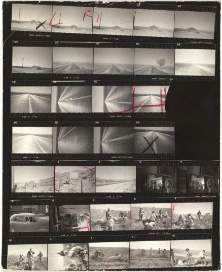 第二天,他们向北驶入285号公路,西南部德州连亘的山丘渐渐变成东南部新墨西哥州的平原,无尽的公路让弗兰克着迷,正如凯鲁亚克所描述的:“(公路)像箭一样伤恸地划开黑暗和夜空下无垠的大地”。弗兰克开始发挥他的特长,在引擎盖前拍了几张照片。后来他走出车,跪在高速路的中心线上,用广角镜头拍摄面前绵延的公路,有的照片还有经过的汽车(底片印样36)。