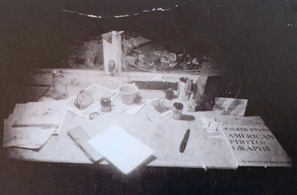 相反地,弗兰克把注意力放在了他们的私人世界中——在廉价的汽车旅馆中拍摄玛丽和孩子们。在圣诞节前,他们抵达洛杉矶,并租住在好莱坞的一处房子。他们卸下行李,把床垫放在地板上,把打包箱当成椅子,用纸板搭成餐桌和写字台。照片中书桌的一角上,正是埃文斯的《美国照片》——弗兰克视之为珍宝,并一路随身携带(图1)。