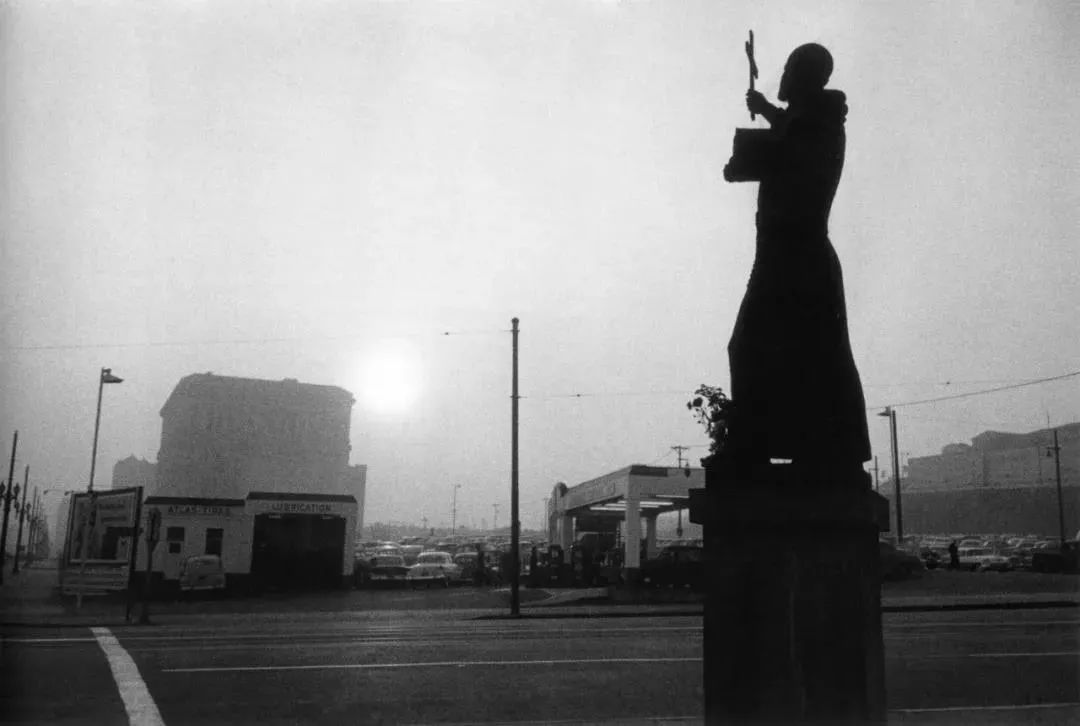 回忆起在洛杉矶法院旁圣方济各(St.Francis)持十字架雕塑的照片,他意识到自己被这座伶仃的雕塑所吸引,是因为圣方济各似乎是在对沉闷的城市中的加油站和小汽车布道,也是因为雕塑脚边的一小瓶花束。背景中钢筋水泥和温情的花束形成鲜明的对比,打动了弗兰克。一位耶和华见证人(Jehovah’s Witness)的虔诚同样也触动了弗兰克,他站在街头分发廉价传单,为其信仰奉献余生(《美国人》图28)。