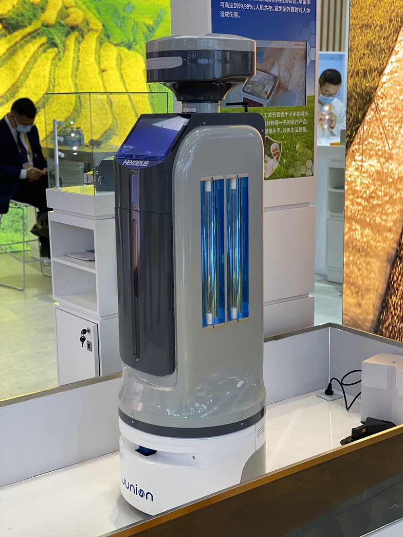 德国贺利氏在进博会现场演示新款复合式杀菌消毒机器人。