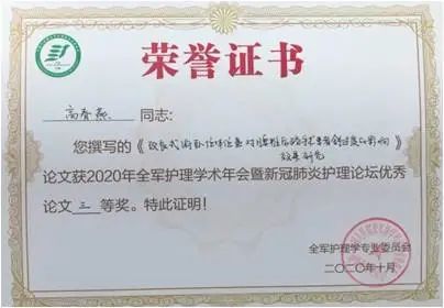 突出成绩二:全军护理学术年会创佳绩在刚刚举办的全军护理学术年会上,上海长征医院护理处取得优异的成绩。刘怡琳《eCASH策略为核心的护理管理方案于危重型新冠肺炎患者谵妄管理的应用研究》荣获二等奖,乔安花《基于新冠肺炎传染病特点的线上线下护理培训方法探讨》、王伟《基于CARCER原则的初次全膝关节置换患者参与的延续护理研究》、高春燕《改良式俯卧位体位垫对腰椎后路手术患者舒适度的影响效果研究》获三等奖。