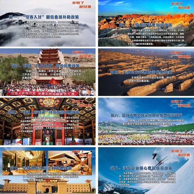 二、“丰收了·游甘肃”八大冬春旅游优惠政策“丰收了·游甘肃”冬春文化旅游惠民活动期间,甘肃省坚持以旅游惠民的实际行动践行以人民为中心的发展思想,重点从八个方面推出一系列“人无我有、人有我优、人优我特”的冬春旅游优惠政策,打出一套旅游惠民的政策组合拳,更好地满足人民群众对旅游美好生活的新追求。一是“引客入甘”翻倍叠加补助政策。着眼激励省内外旅行社招徕游客,甘肃省文旅厅专门修订了《“引客入甘”补贴实施办法》,新增加了补助对象和补贴项目,特别提高了补贴标准,其中旅游包机补贴标准由1—2万元提高到2—5万元,旅游专列补贴标准由2万元提高到4—5万元,并实行省市叠加补贴政策,叠加补贴标准由20%提高到40%,冬春季补贴标准由原来上浮40%提高到80%;二是A级旅游景区特惠旅游优惠政策。世界文化遗产莫高窟、玉门关和鸣沙山·月牙泉、平凉崆峒山等5A级景区面向全国游客率先实行半价等优惠政策,嘉峪关关城、张掖大佛寺、兰州青城古镇、宕昌官鹅沟、天水南郭寺、定西渭河源等全省323家A级景区面向全国游客实行免门票、半价或大幅打折等优惠政策;三是致敬“白衣天使”旅游优惠政策。12月31日前继续落实全国医务工作者福利游甘肃优惠政策,全省128家A级景区(世界文化遗产)面向全国医务工作者实行免门票政策,115家星级酒店实行住宿半价优惠政策;四是关爱公安民警旅游优惠政策。全省旅游景区对全国公安民警一律实行免费开放优惠政策;五是“甘肃人游甘肃”特价旅游优惠政策。全省100多家A级旅游景区面向甘肃居民实行免门票或半价等特价旅游优惠政策,其中鸣沙山·月牙泉、张掖七彩丹霞、雅丹世界地质公园、瓜州锁阳城、平山湖大峡谷、大云寺·王母宫等4A级以上旅游景区实行免门票政策,天水麦积山、庆阳周祖陵等景区实行半价优惠政策。六是部分市州全域实行景区免费旅游政策。甘南州、金昌市等市州和兰州新区对辖区内A级旅游景区面向全国游客实行全域免费开放惠民政策;七是星级酒店住宿让利优惠政策。全省384家星级酒店面向全国游客分别推出住宿3—8折优惠和团购特价、捆绑套票、增值服务等促销让利优惠等政策;八是涉旅企业暖心惠民旅游政策。冬春季期间,全省18个滑雪场、温泉度假村、重点旅行社和“铁公机”等交通枢纽均会推出“机票+景区”“火车票+景区”等套票体验和惠民特购、组团促销、尊享体验、旅游消费扶贫等一系列不同形式的惠民让利减免政策,合力提升入甘旅游的获得感。