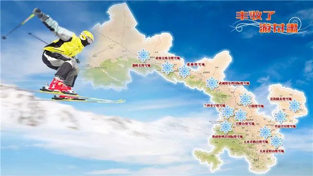 主要滑雪场:兰州安宁滑雪场、兴隆山滑雪场、皋兰龙山国际滑雪场,兰州新区冰雪新天地滑雪场,嘉峪关悬壁长城四季滑雪场,永昌县南坝滑雪场,张掖山丹佛山滑雪场,武威塔儿湾滑雪场,天祝乌鞘岭国际滑雪场,白银黄河石林滑雪场,天水青鹃山滑雪场、麦积山滑雪场,平凉崆峒区海寨沟滑雪场、泾川天池滑雪场,定西渭河源景区滑雪场,临夏松鸣岩国际滑雪场、甘肃抱龙山凤凰岭滑雪场, 庆阳陇东冰雪健身基地;