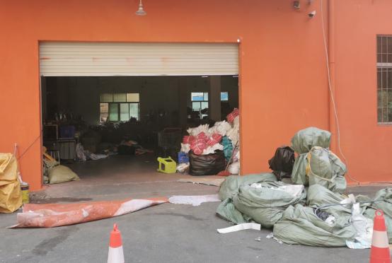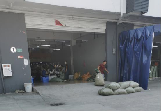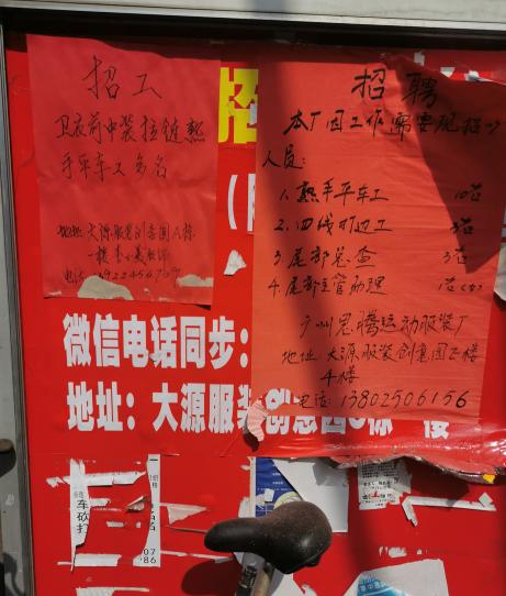 距离大源国际电商创意园不远处,则是“大源服装创意园”。与上一个“创意园”类似,该园区更像是一个服装加工厂的集聚区。园区入口张贴着许多服装工人的招聘广告,而园区内则分布着多家服装加工厂,虽然是午饭时间,但记者依然看到许多工人进出运货,而不少工厂大门外则散落堆积着许多服装产品。
