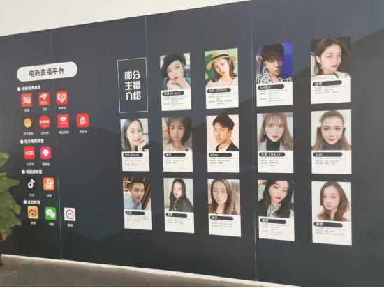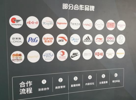 走入大源电商直播基地,记者在墙上看到有着关于该直播基地的相关介绍,包括直播平台、部分主播介绍以及部分合作品牌,其中就包括娃哈哈、宝洁、美的、三只松鼠、耐克、阿迪达斯等各领域头部品牌。