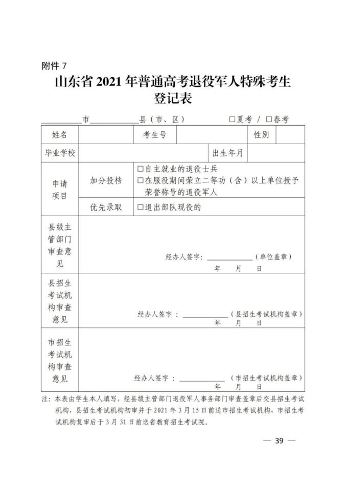 (1)申报。在现场资格审查及信息确认时须携带相关证明、证书等原始材料及复印件1份。相关考生要填写《山东省2021年普通高考退役军人特殊考生登记表》(附件7),经县级主管部门退役军人事务部门盖章后,连同证明、证书复印件交县级招办,由县级招办审核考生身份并办理登记手续。