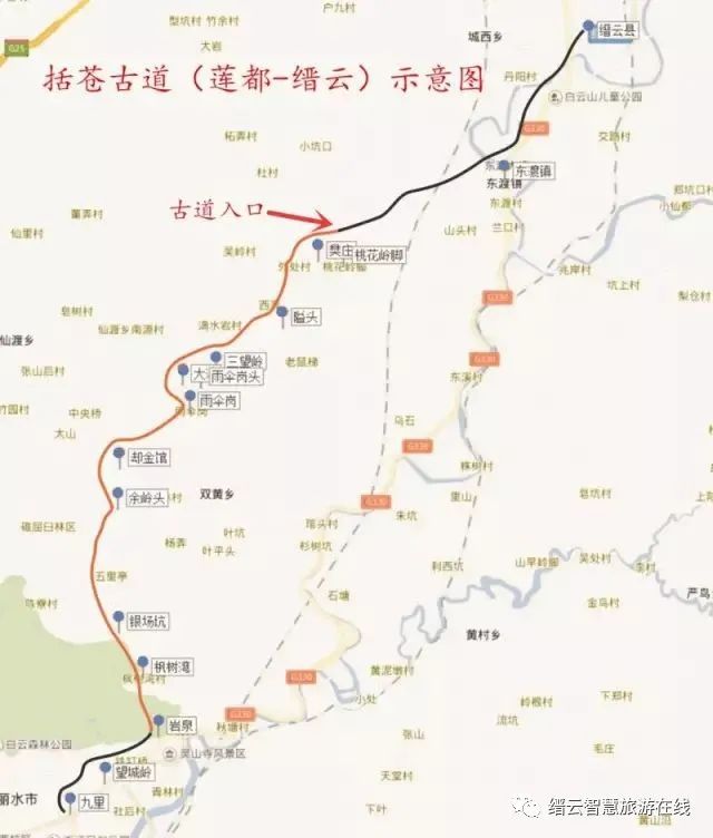 苍岭古道起点为缙云县壶镇镇苍岭脚村,终点为仙居县横溪镇苍岭坑,全长约35公里,缙云段约25公里。