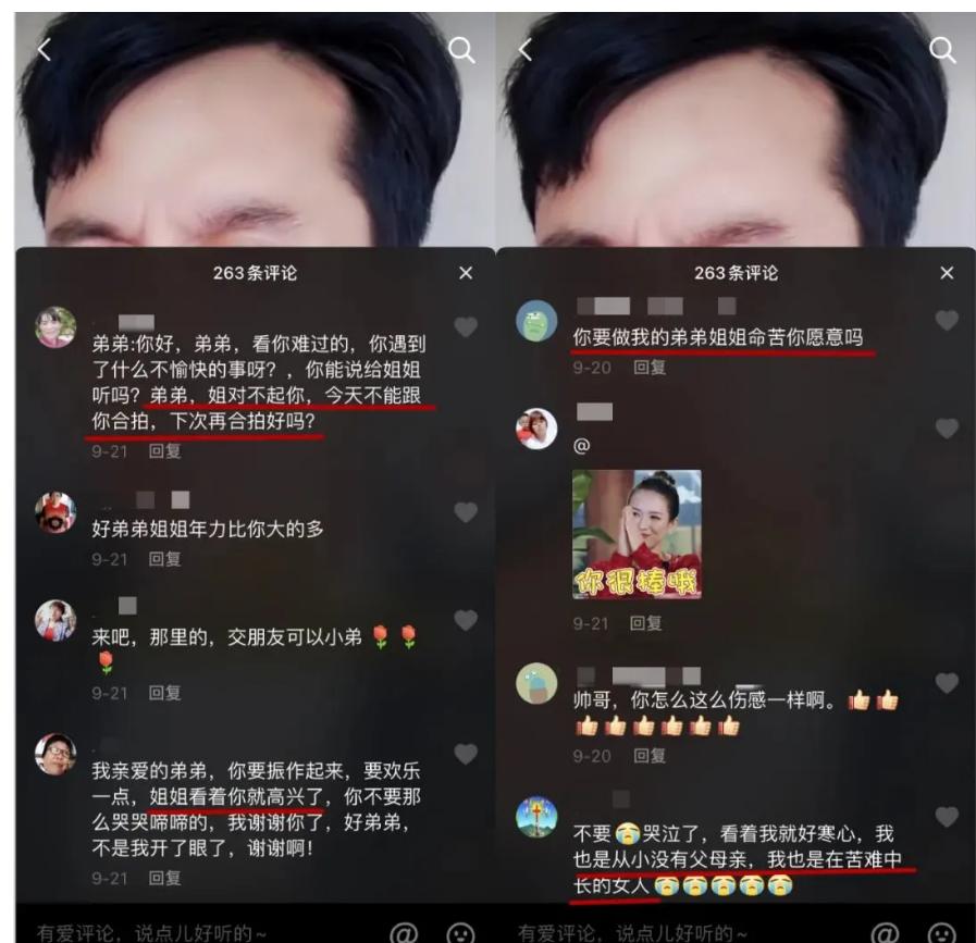 “姐姐,你真的是人美心善,愿意听弟弟讲那么多”“大哥我真的好想你,隔着一个屏幕,你都能影响我的心情”“姐姐你怎么不给我点赞了?”、“姐姐你是删了我吗?姐姐是不是不喜欢我了?”“你要做我的弟弟姐姐命苦你愿意吗?”