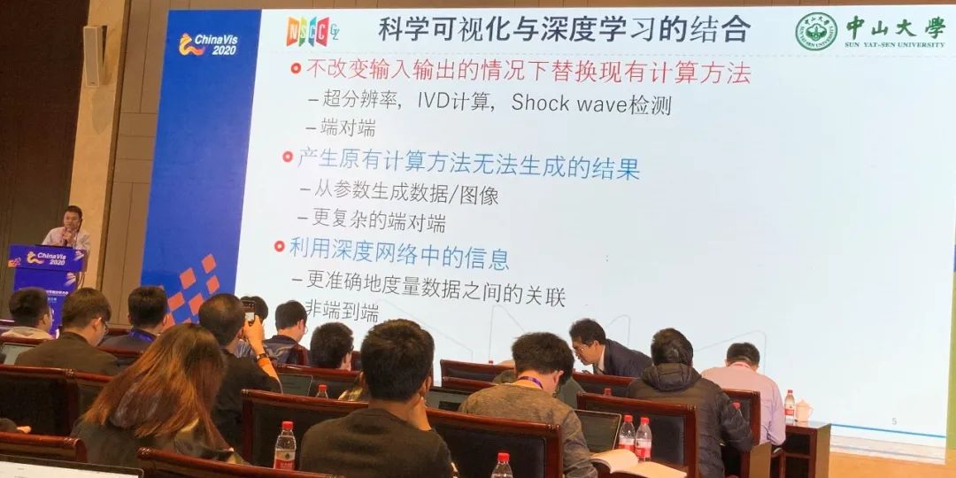 来自中山大学的陶钧副教授总结了科学可视化与深度学习相结合的相关工作。具体而言,共有三种可以结合的方式。其中第一种方式是在不改变输入输出的情况下替换现有的计算方法,利用深度学习的方法解决原有问题。该方面的工作集中在超分辨率、流场计算、流线重构等应用中,且主要利用深度网络端对端的特性来学习输入与输出的复杂变换,通常采用GAN的架构进行学习。第二种方式可以产生原有计算方法无法生成的结果,相比于第一种方式是更为复杂的端对端的学习模式。该方式意图捕捉参数与输出之间的联系,主要任务依然是数据或图像生成,但此时输入信息与输出之间严重不对等。最后一种方式主要意图利用深度学习网络中学到的信息,如通过自编码器对数据进行编码从而学习数据之间的关联。最后陶钧老师总结了未来可以探索的方向,包括如何在更多类型的数据之间建立联系,如何将人的领域知识嵌入到深度学习模型中,如何探索深度学习模型学习到的信息。