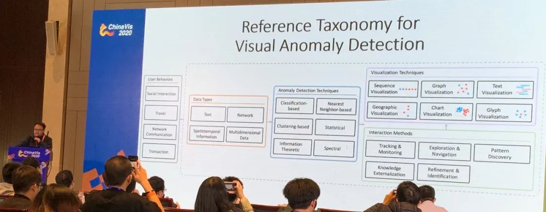 来自同济大学的曹楠教授总结了近年来异常检测与可视分析交叉的相关工作。异常检测是数据挖掘中的经典任务,其试图挖掘出在其它数据中所不同的模式。异常检测主要有三个挑战。其一是异常检测的定义十分多元,在不同领域及场景中有不同的定义,其二是异常检测通常需要标签数据,然而在真实场景中这种数据非常稀疏,最后是其面临着可解释的问题,而可视化可以很好地解决这三个问题。接着,曹老师将现有的工作根据用户行为、数据类型、异常检测技术、可视技术及交互技术进行了分类。其中用户行为是指异常检测应用的场景,如社交媒体中的用户之间的交互及交易行为。数据类型包括文本、网络、时空数据及高维数据。异常检测技术有基于分类、聚类及信息论等的方法。可视化技术包括序列可视化、图可视化、文本可视化等。交互技术包括监测追踪、浏览、模式分析、知识外化与精炼等。最后,曹老师总结了该领域可能的研究机会,如现有工作缺少关于协同行为及文本数据异常检测的研究,除此之外,如何为模型提供反馈以进行模型精炼是未来的研究热点。
