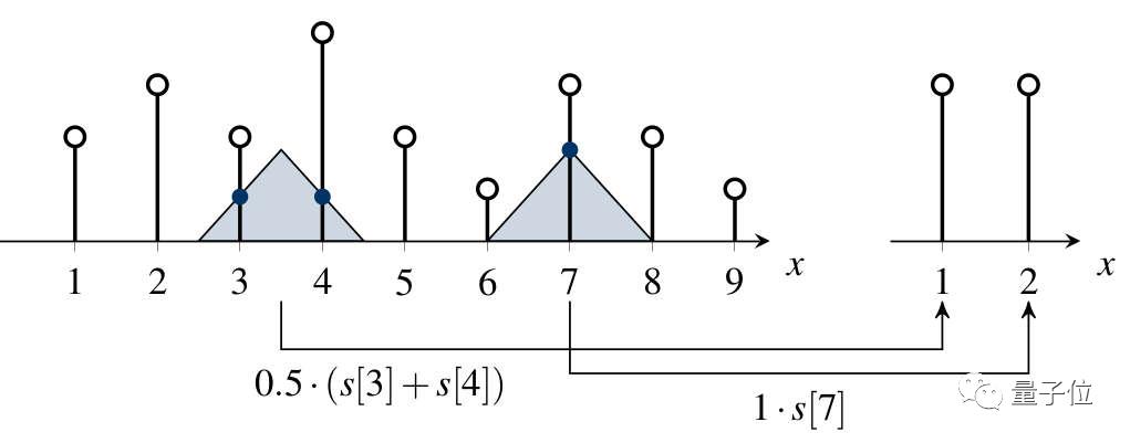 压缩图的像素是这样算出来的:滤波器窗口在图片源信号s上移动,将窗口中的每个像素值(图中圆圈)乘以该位置窗口上的权重,得到缩略后的点值。