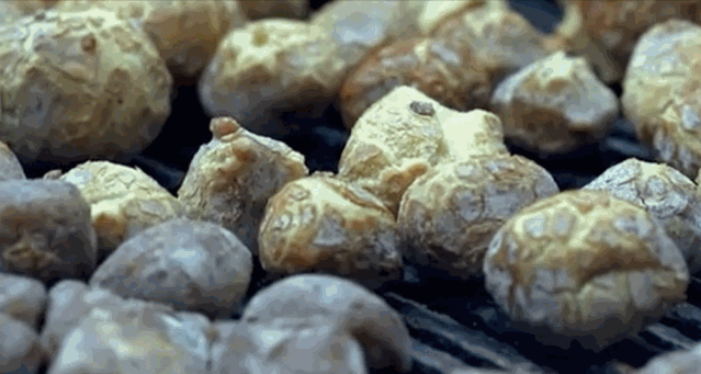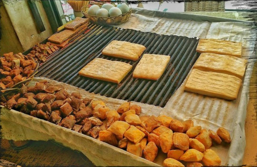 建水的烧豆腐以一个个的小豆腐最出名。小豆腐块不大,像棋子大小,发酵成熟的豆腐呈黄褐色,表皮刚硬。放在炭火上烘烤,表皮膨胀裂开,豆香弥漫开来。