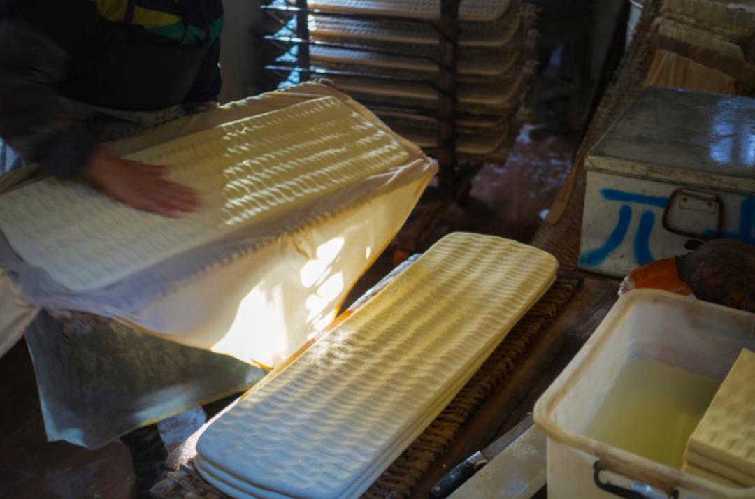 每天天刚亮,就能在大板井边看到制作豆腐的流水线。小块纱布包裹嫩豆腐,用木板挤压出水分后定型,再风干三、四天,水分除去六、七成,建水小豆腐就做成了。
