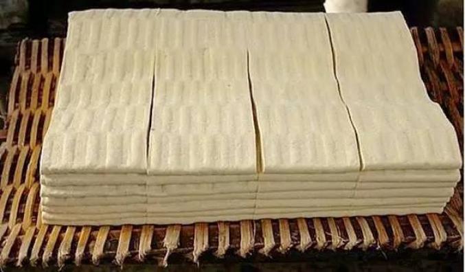 石屏豆腐,从长相上看,就不一般。其体形巨大,长约28cm,宽约8cm,厚约2cm,颜色略微黄,极具韧性,不易破损,提溜起来一甩,有DuangDuang的动感。