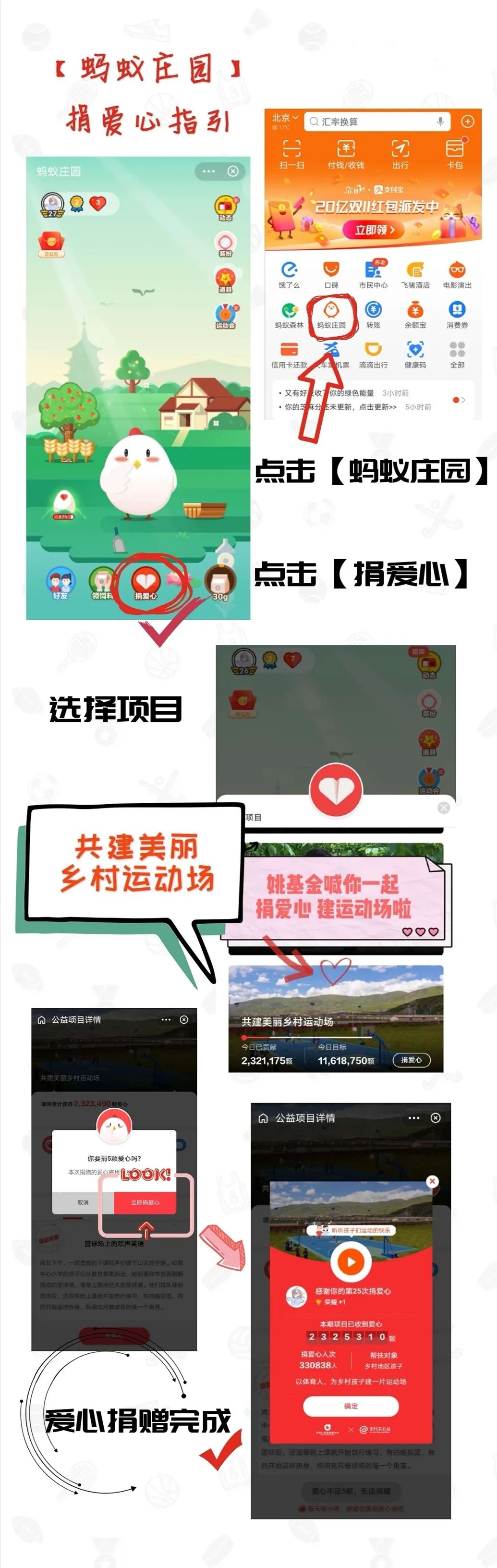 11月9日至15日,点开支付宝“蚂蚁庄园”界面——捐赠爱心——点击“共建美丽乡村运动场”项目——选择爱心数量——立即捐赠您的爱心,爱心会由中国人寿慈善基金会按比例捐赠!