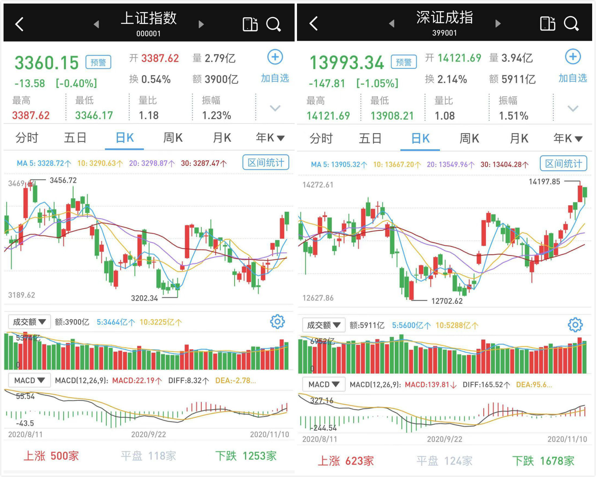 11月10日,沪深两市成交总额9812亿元,较前一交易日的10835亿元骤减1023亿元。其中,沪市成交3900亿元,比上一交易日4299亿元减少399亿元,深市成交5912亿元。
