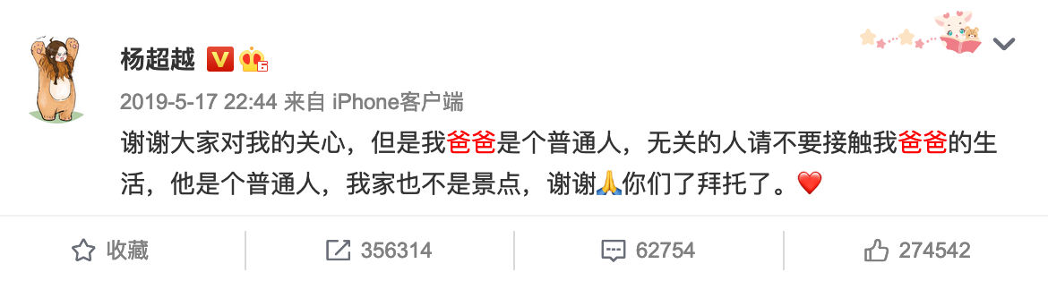 面对众人的打扰,杨超越曾发文说:爸爸只是个普通人,希望大家不要打扰。现在她试图让家人的生活回到正轨上来,这一刻,她不再是朋友圈里的锦鲤少女,也不是什么“影响中国”的流量明星,而仅仅是一个尽量给父母好的生活的女儿而已。