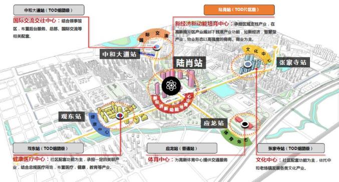 陆肖TOD以产业集中的陆肖站为中心,周边的中和大道站、张家寺站、观东站、应龙站,分别承担国际交流、文化中心、健康医疗中心、体育中心等相应配套功能。