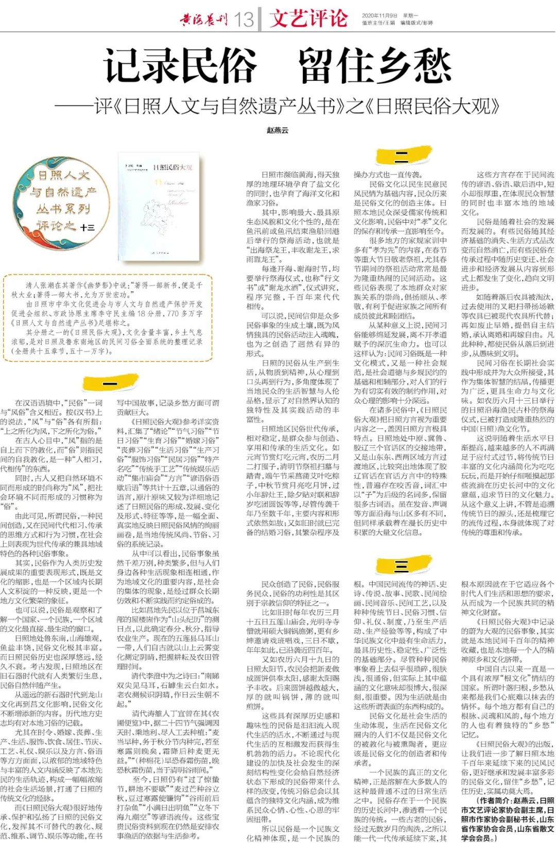而《日照民俗大观》很好地传承、保护和弘扬了日照的民俗文化,发挥其不可替代的教化、规范、维系、调节、娱乐等功能,在书写中国故事,记录乡愁方面可谓贡献巨大。