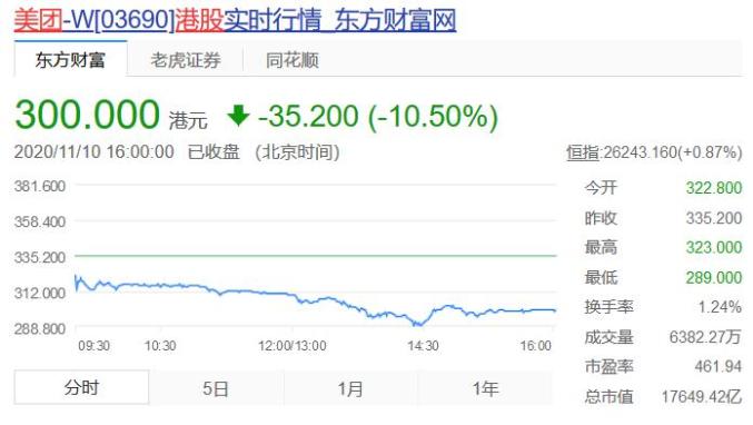 恒生科技指数一度跌近7%,美团一度暴跌超13%,跌破300港元关口,收盘跌10.5%,勉强站稳300港元。