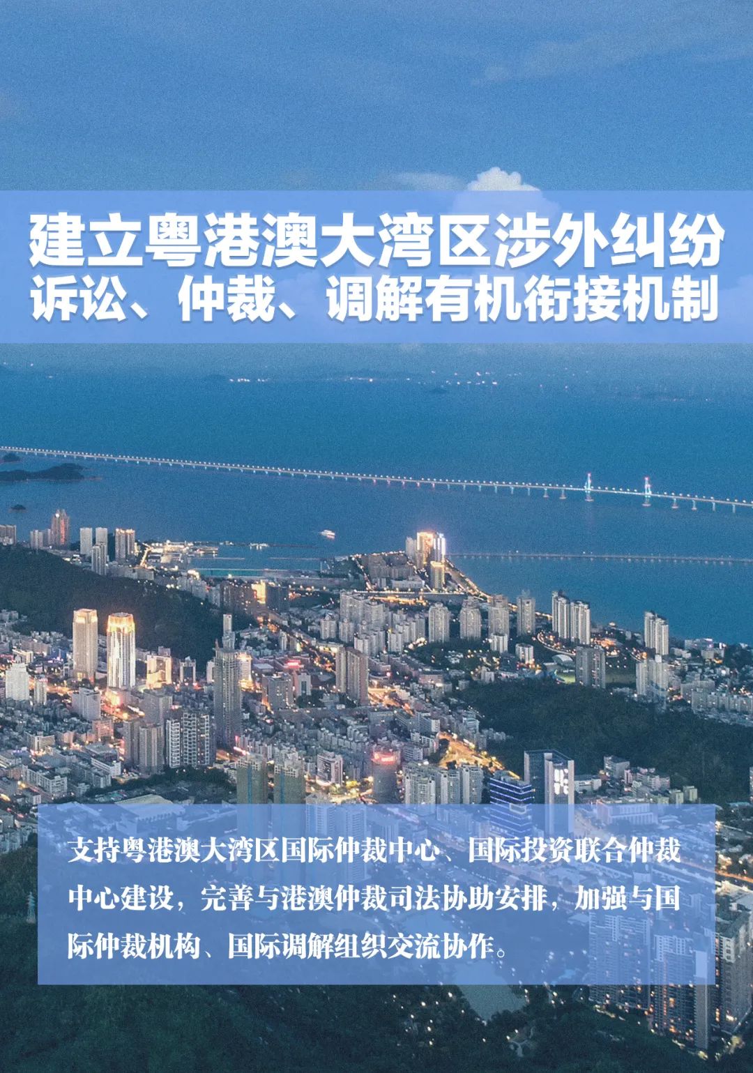 支持粤港澳大湾区国际仲裁中心、国际投资联合仲裁中心建设,完善与港澳仲裁司法协助安排,加强与国际仲裁机构、国际调解组织交流协作。9