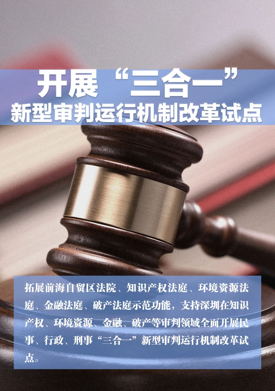 拓展前海自贸区法院、知识产权法庭、环境资源法庭、金融法庭、破产法庭示范功能,支持深圳在知识产权、环境资源、金融、破产等审判领域全面开展民事、行政、刑事“三合一”新型审判运行机制改革试点。10