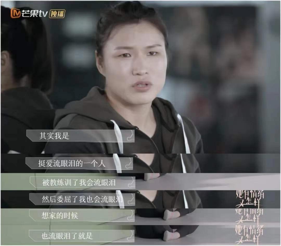 “我很感性,很爱流眼泪,被教练训了,委屈的时候,想家的时候,我会流眼泪。有一次采访的时候我哭了,还上了热搜。”