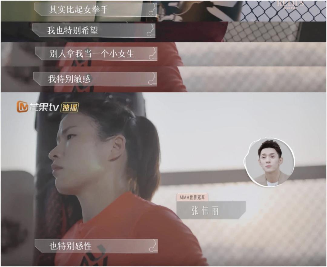 沈奕斐老师也问了这个问题:“格斗会需要年轻的,你有没有担心以后会让身边的人失望?”“没有,你不可能一直赢,你会有起伏,只能说,上去漂亮点,下来漂亮点。”一个人有很多面,像钻石一样,哪怕哪一天张伟丽不拿冠军,她是一个丰富的人,多面的人,她有其他面在支撑她。