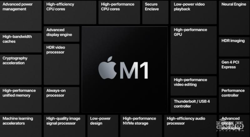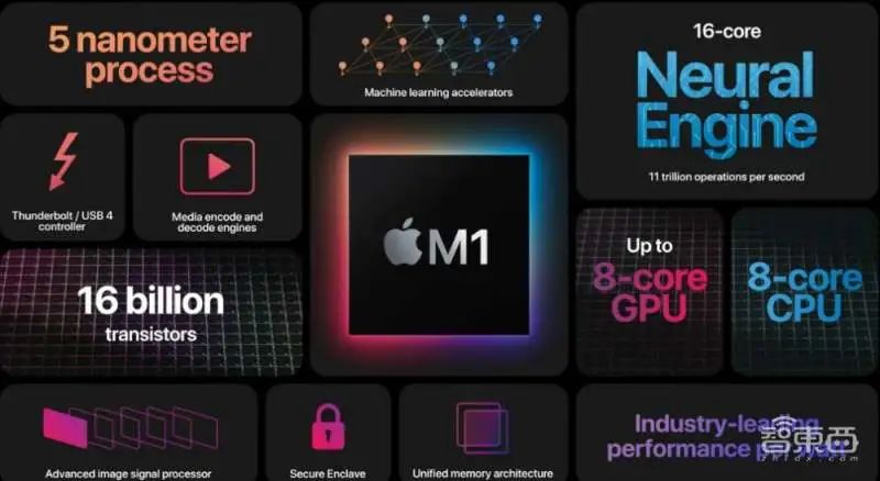 M1芯片采用5nm工艺,包含160亿个晶体管,将CPU、GPU、神经网络引擎、各种连接功能以及其他众多组件,统统集成在一颗系统芯片(SoC)中,具有高能效、体积小、高带宽、低延时等特点,并支持雷雳/USB 4端口接口。