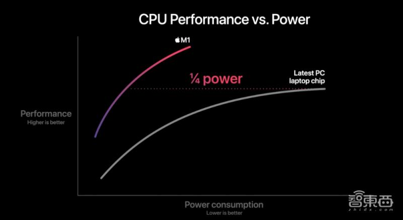 在消耗10W功耗时,M1芯片CPU的性能是其他最新PC芯片的2倍。达到同一性能,M1芯片CPU的功耗只有其他PC芯片的1/4。