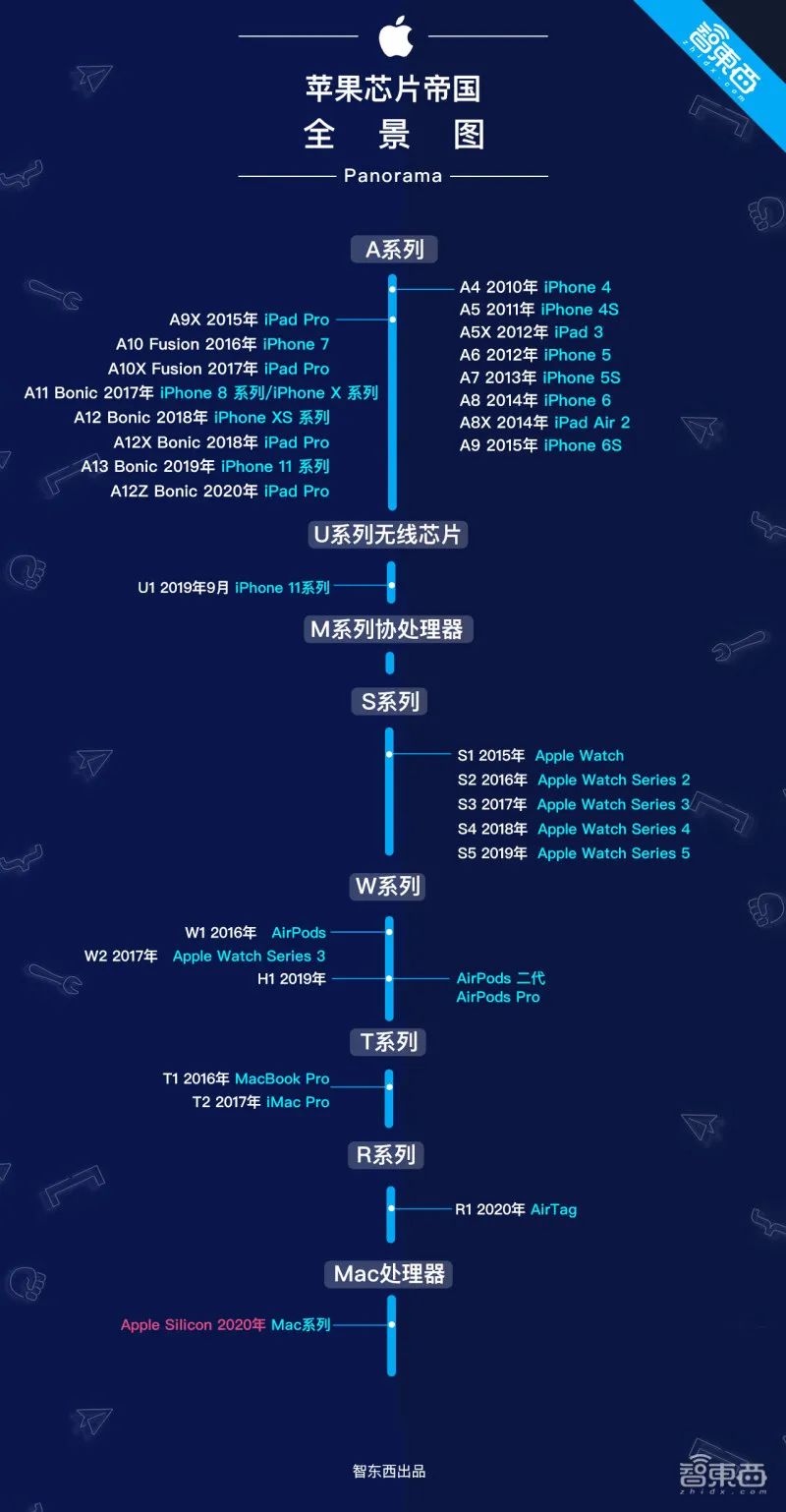 如今其自研芯片已经几乎覆盖到苹果所有硬件产品,包括iPhone、iPad、HomePod、Apple TV、Apple Watch、AirPods,还有Mac。