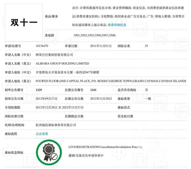 2011年11月1日,阿里集团在第35类广告等服务上申请注册了“双十一”文字商标,并于2012年12月28日获准注册。记者登录中国商标网查询了解到,该商标是阿里巴巴最早提交的“双十一”商标之一。