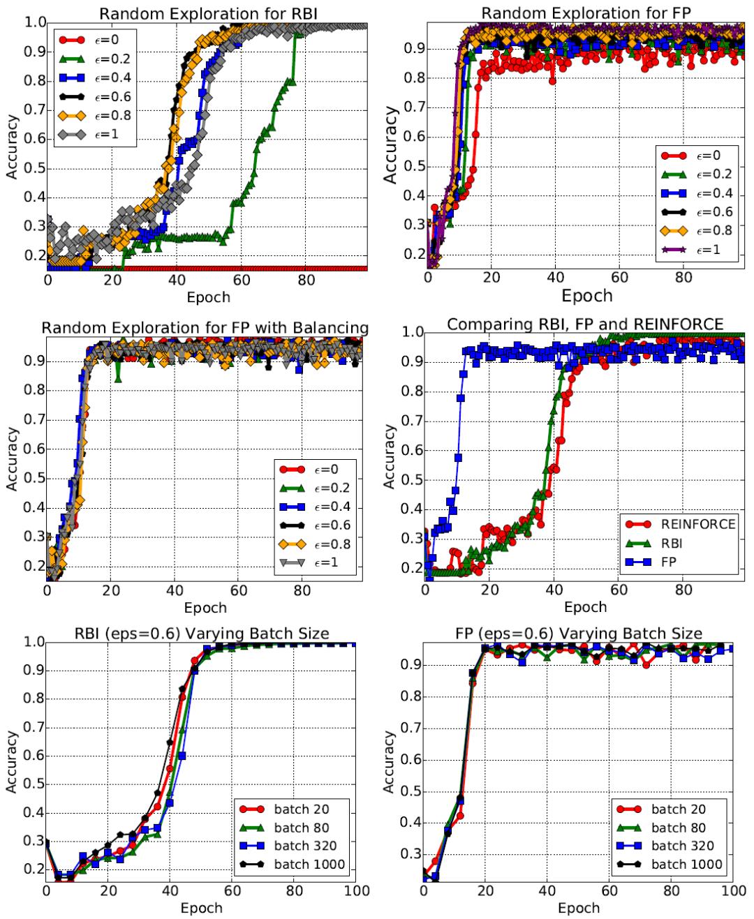 首先,作者在不同批量大小、随机探索率和模型类型的情况下进行实验。图 6 和图 7 分别给出了 bAbI 和 WikiMovies 的结果(任务 6)。由实验结果可得出如下结论:一般情况下,RBI 和 FP 在强化学习环境下工作,但在随机探索下表现更好;如果没有附加探索的步骤,RBI 可能会陷入失败。即,RBI 需要探索有标记数据的随机噪声,否则它可能会预测得到一个标签子集而最终失败;在最优的情况下,REINFORCE 与最优探索概率为ε的 RBI 具有相似的性能;采用平衡或概率为ε的探索处理的 FP 均优于单独的 FP;对于 RBI 和 FP,性能在很大程度上与在线批处理大小是无关的。